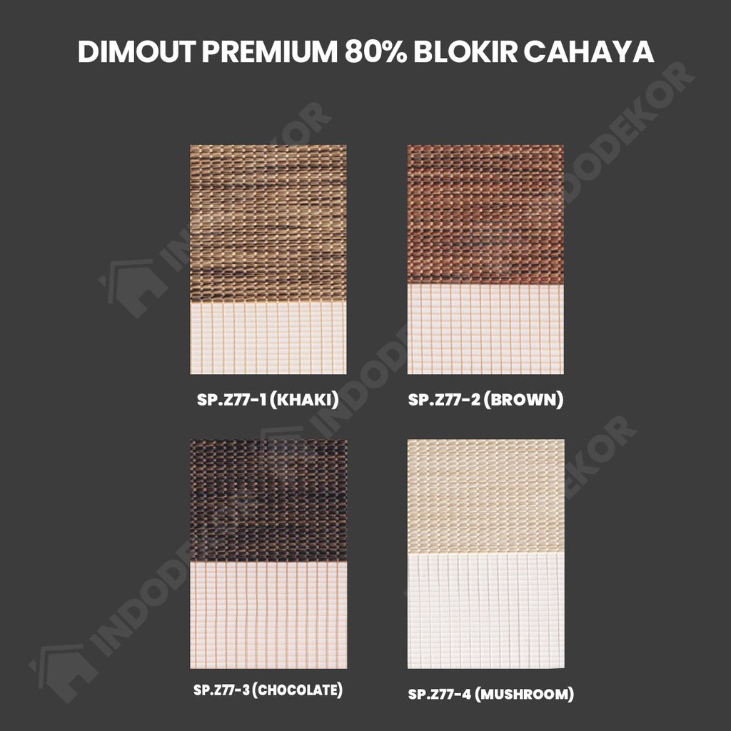 - Blackout: Bahan coated (berlapis), blokir cahaya hingga 100%