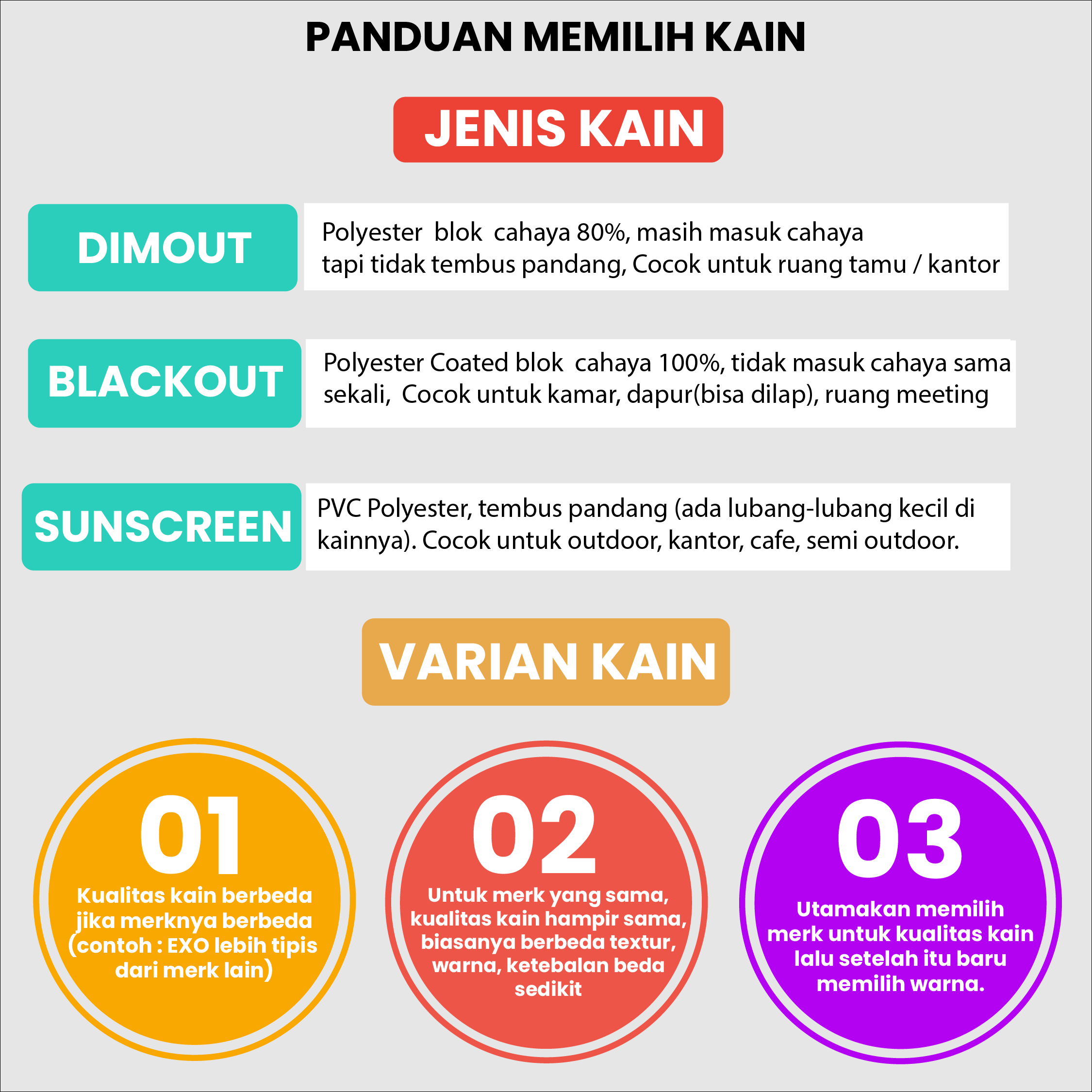 - Blackout: Bahan coated (berlapis), blokir cahaya hingga 100%